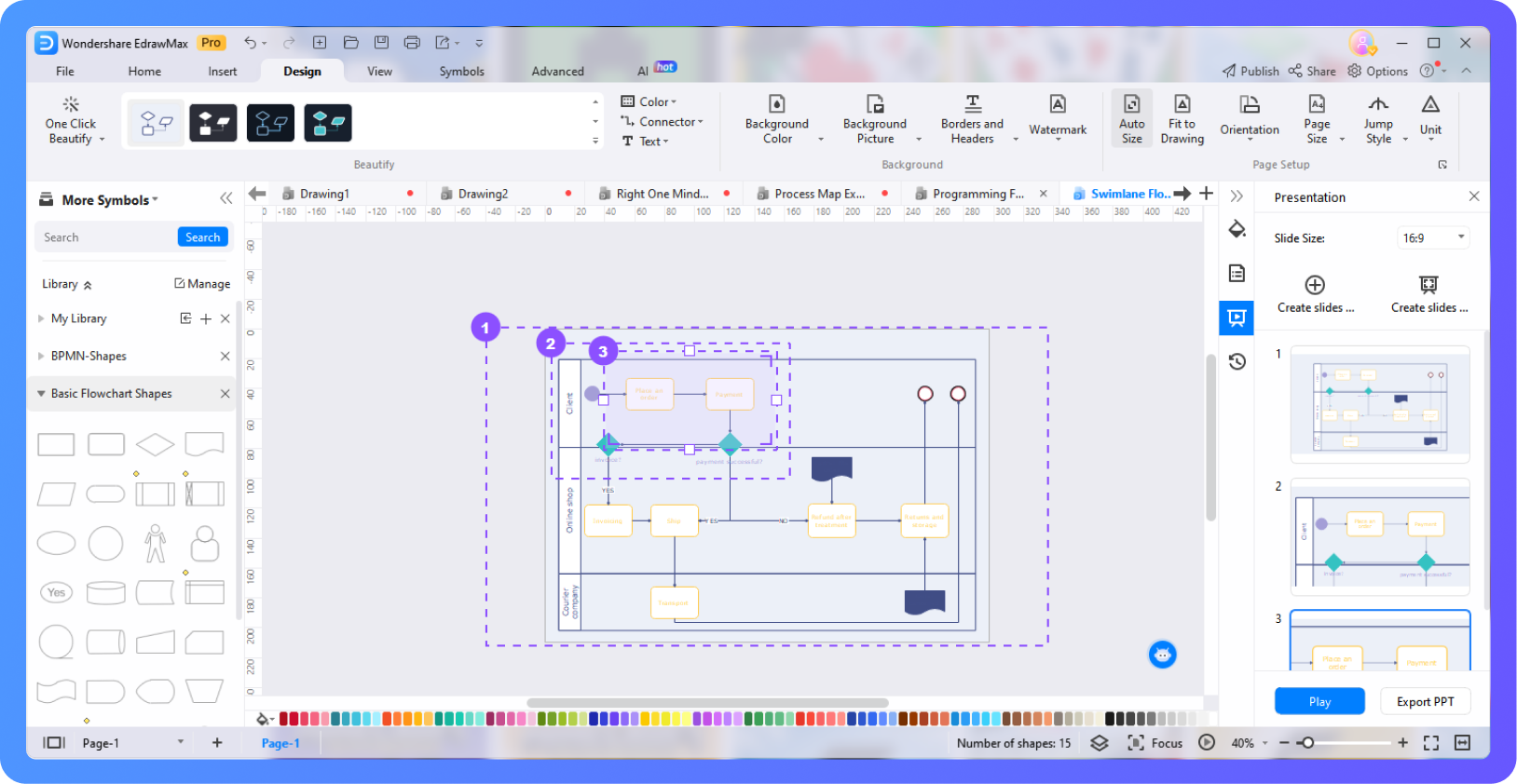 - Drag-and-drop symbols from 30+ specialized libraries (BPMN, ANSI, etc.).