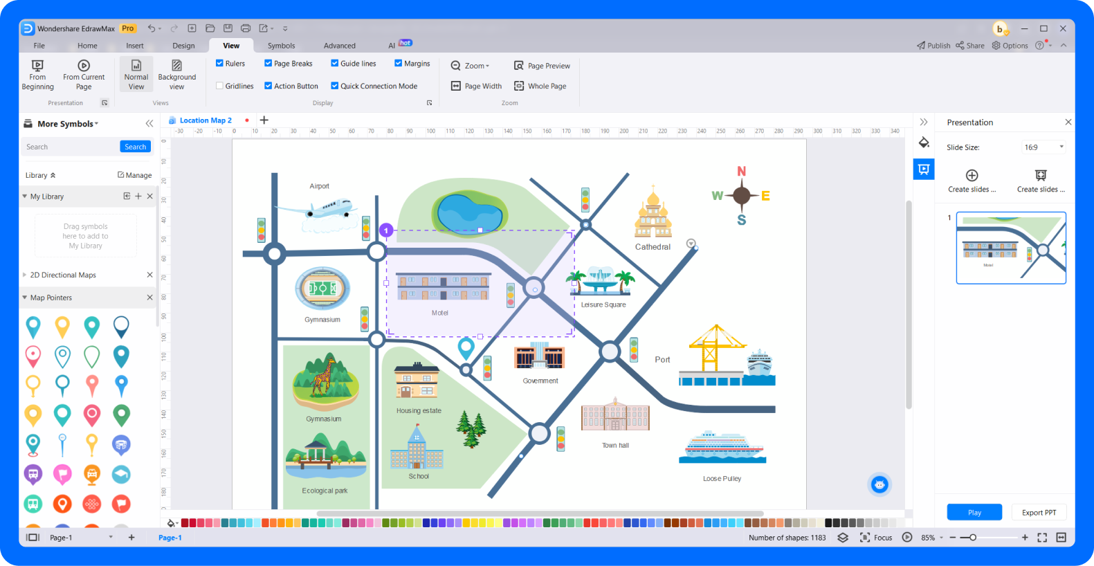 EdrawMax features an extensive collection of map symbols. Just visit the library and click More Symbols > Engineering > Maps > 2D Directional Maps, Road Signs, Subway, Map Pointers, etc. Create a personalized library by importing these symbols for repetitive use.