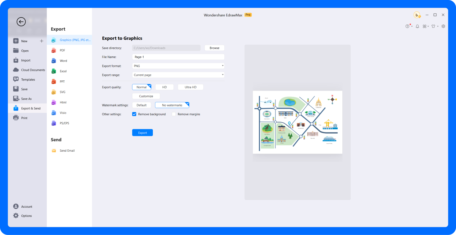 EdrawMax makes exporting possible in over ten formats, including Visio, MS Office, PNG, PDF, and more. All you need to do is click Export from the quick-access toolbar and select a preferred format.