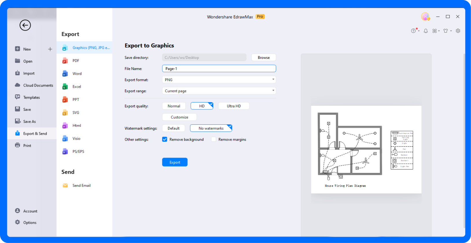 How do I export my wiring diagram in a PPT format?Exporting wiring diagrams in a PPT format is straightforward. Navigate to the File menu from the top-left corner and click Export > PPT. You can also download it in other formats like PNG, Visio, PDF, JPG, and more.