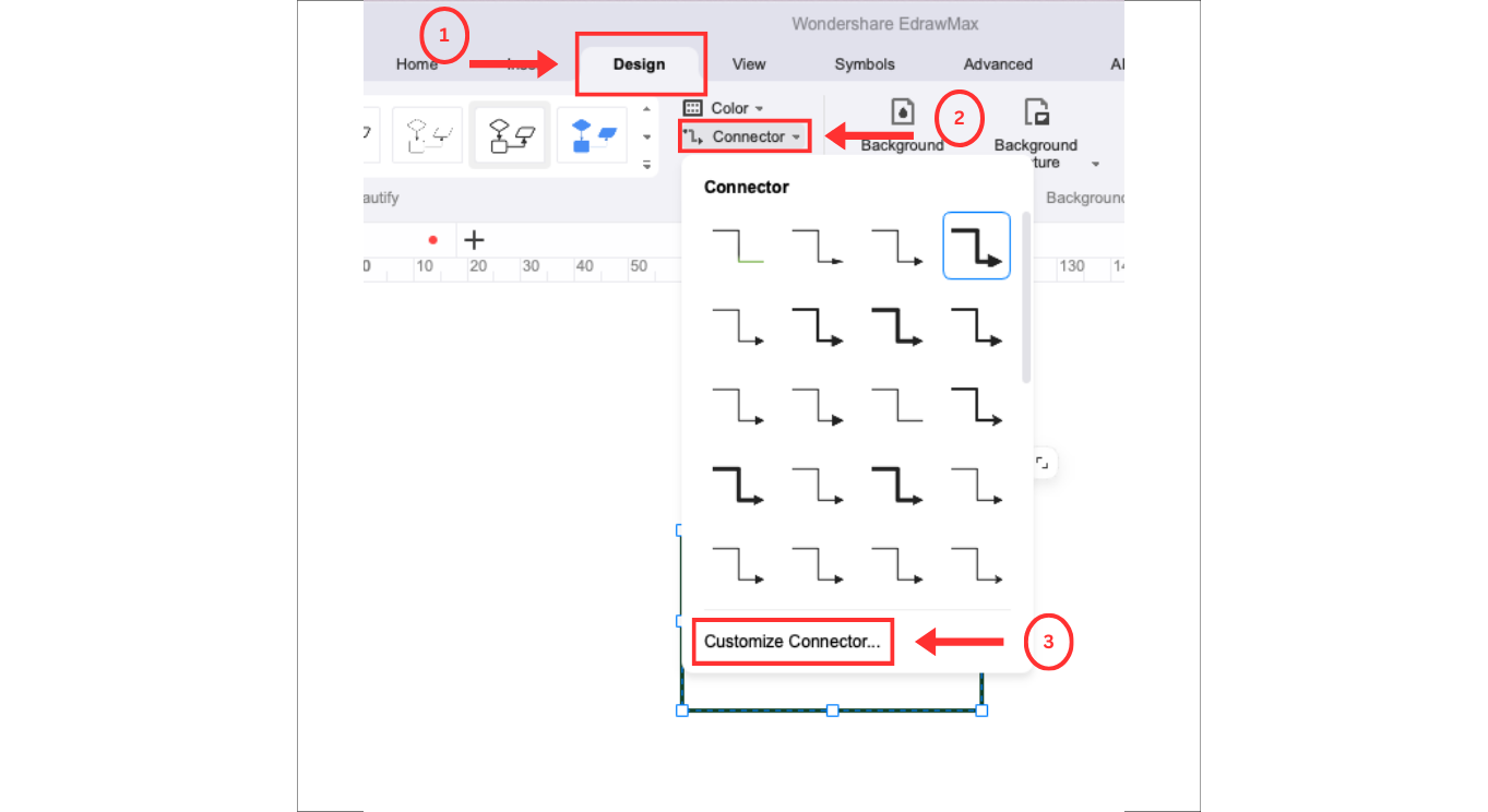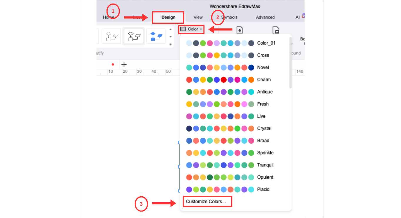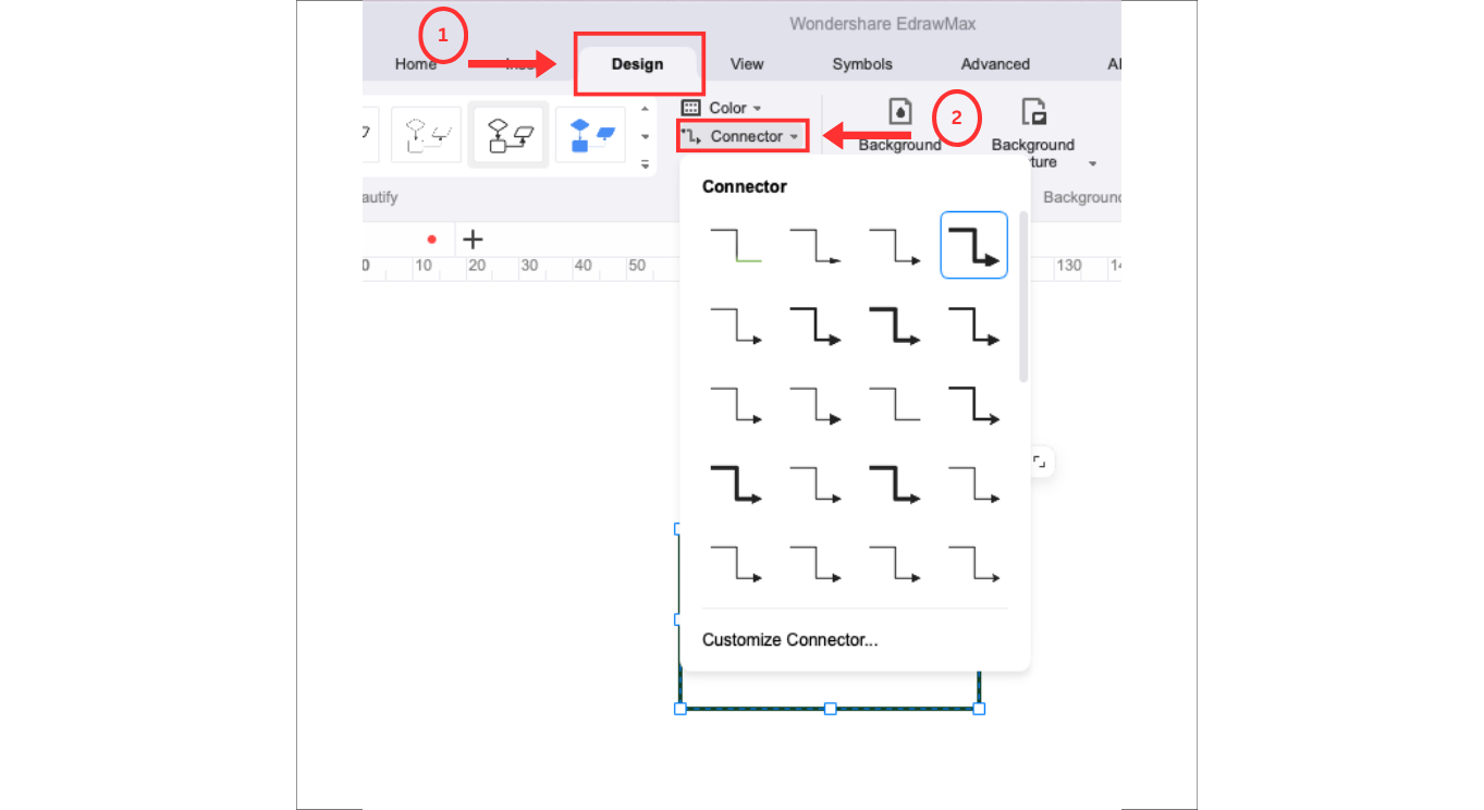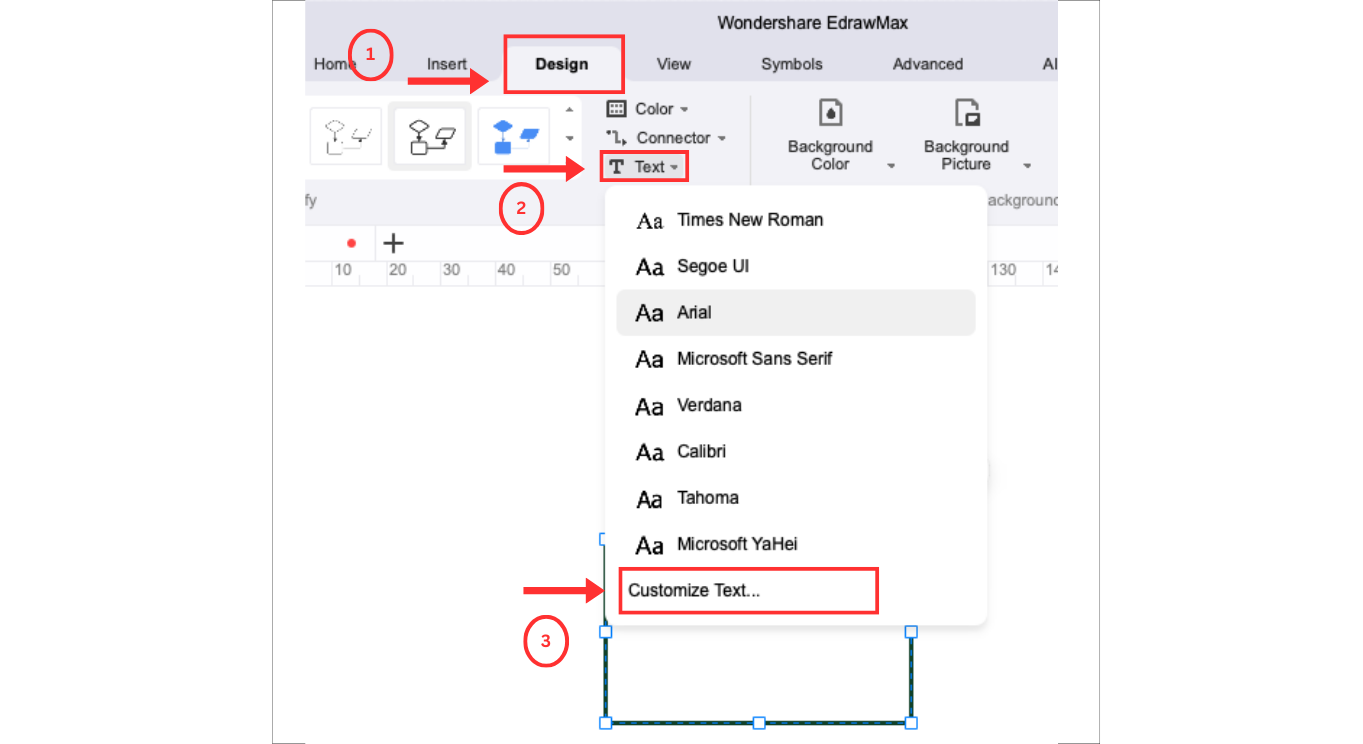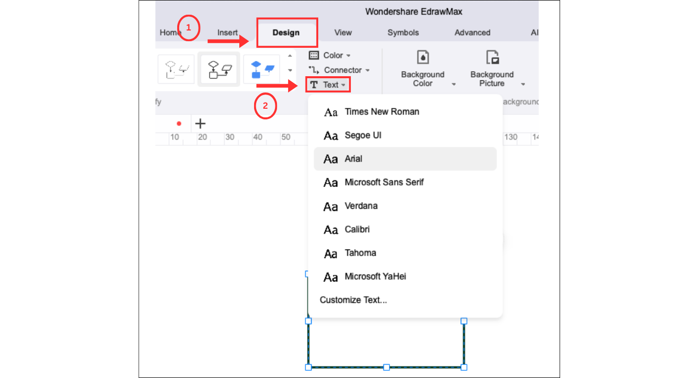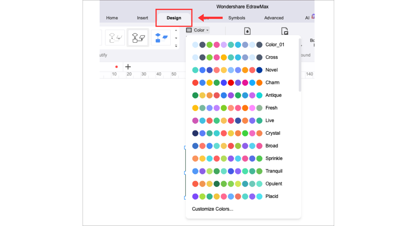 EdrawMax lets you create your customized theme, so you won’t have to customize everything from scratch every time you start drawing. For the customization option, click on Design at the top bar and check out the different options present in the Color, Connector, and Text options.