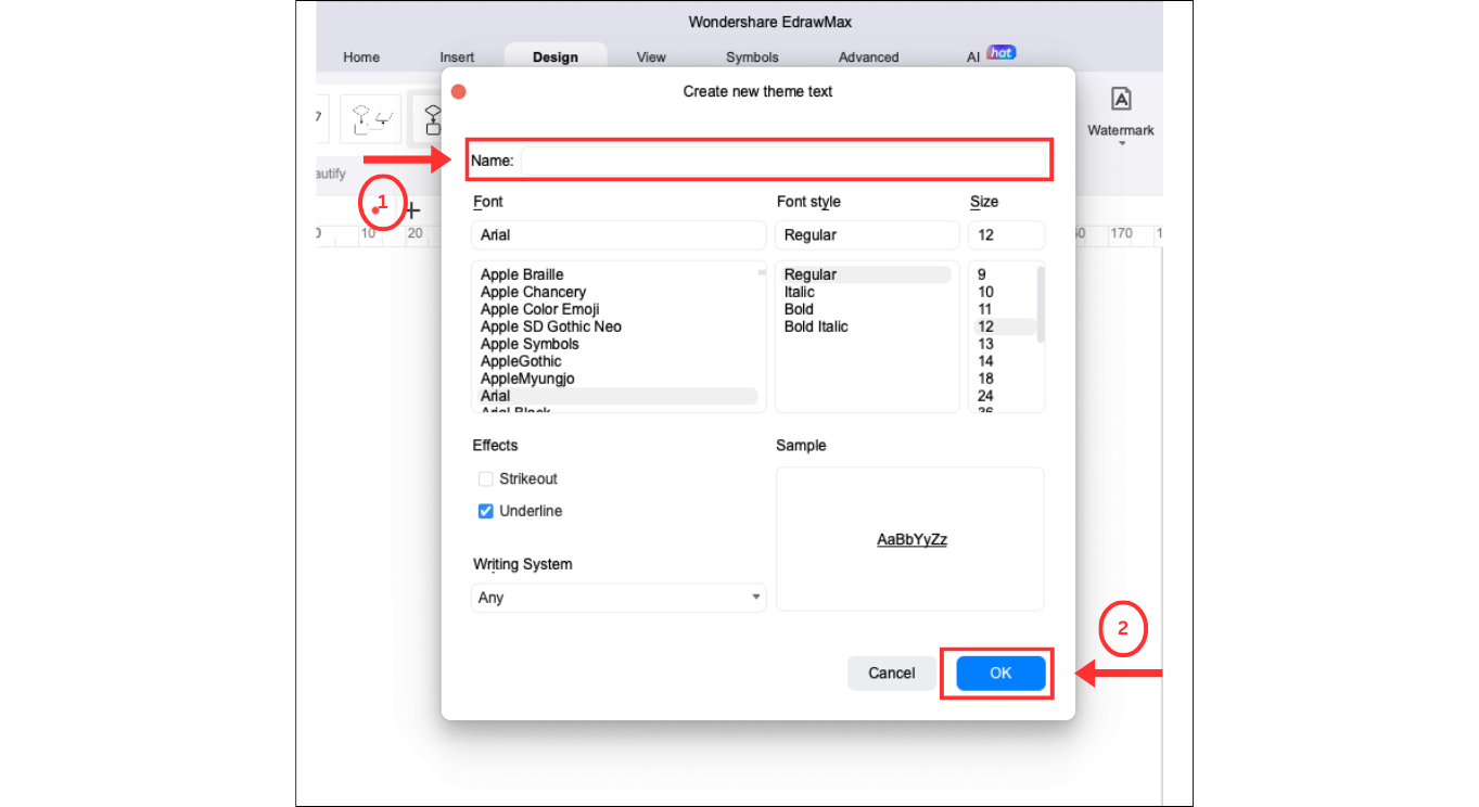 To create your customized text option, Click on Design > Text > My Text > New Text. A new pop-up window will appear from where you can modify the new theme font type and size.