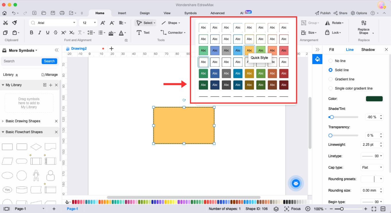 From the Quick Edit pop-up window, you will find a variety of options that help you modify the general style and appearance of the selected shapes and objects.
